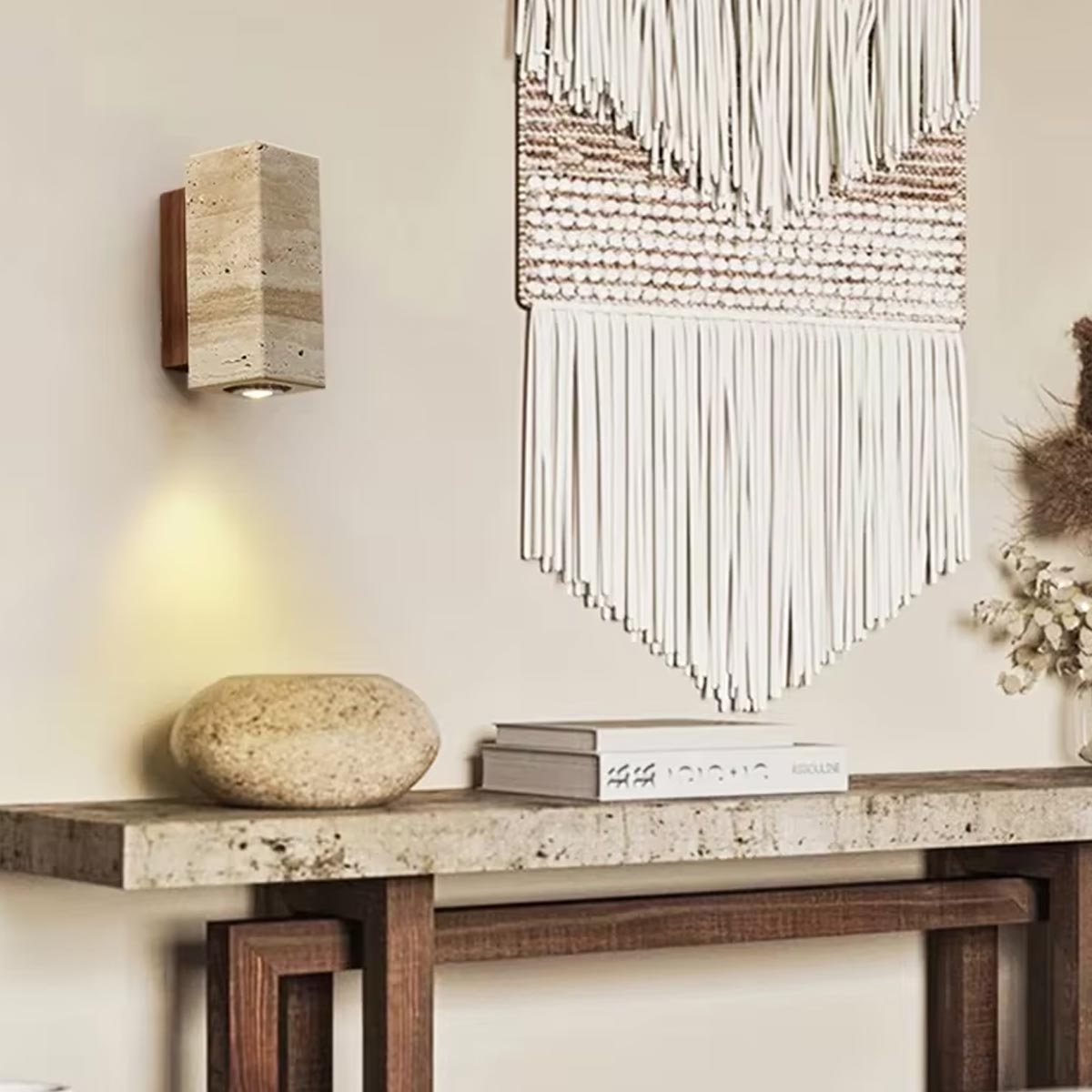 Cette applique murale rectangulaire en travertin et bois séduit par ses lignes sobres et son caractère minéral affirmé. Le travertin naturel, aux nuances délicates et irrégulières, s’associe harmonieusement au bois pour offrir un luminaire à la fois authentique et contemporain.